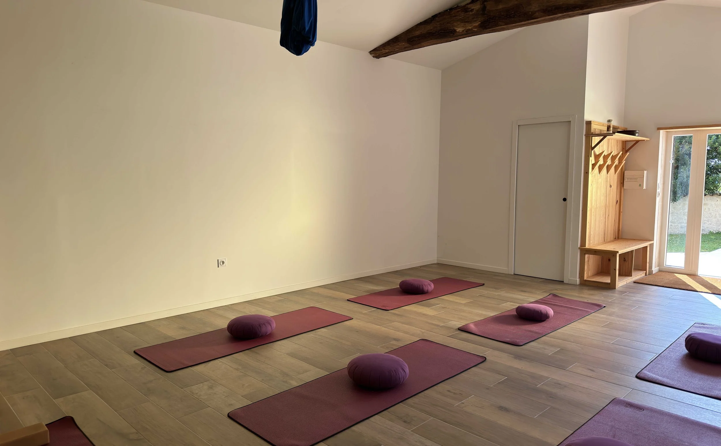 Le lieu dispose d'une grande salle de pratique entièrement équipée (tapis, zafus, bolsters, briques, couvertures…).